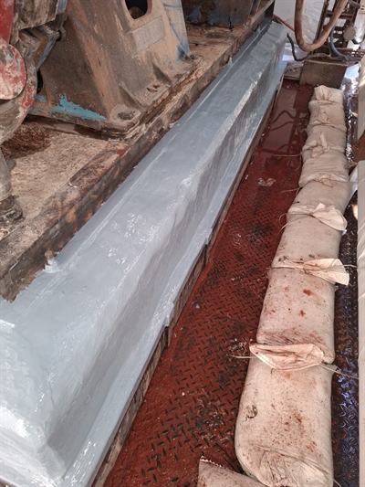 - Méthode d’application : La zone a été nettoyée au jet d’eau haute pression pour éliminer les résidus caustiques. Le produit Belzona 4911 a été utilisé comme conditionneur de surface avant l’application du produit Belzona 4131, lequel a servi à remodeler le profil des socles. Le produit Belzona 4981 a été utilisé comme conditionneur avant l’application du produit Belzona 4181, qui confère une résistance aux produits caustiques à haute température.